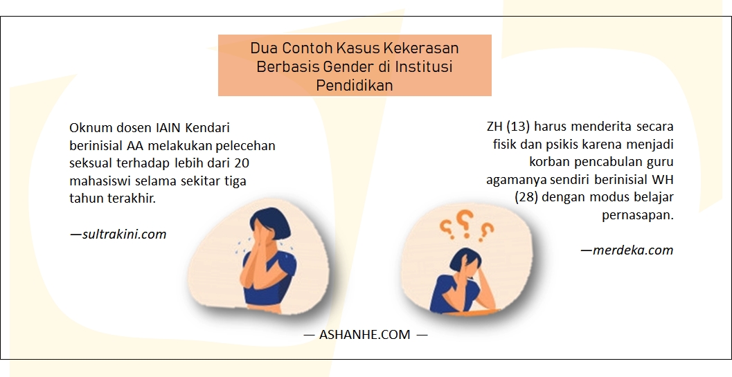 Relasi antar penghuni institusi pendidikan secara tidak langsung menimbulkan jarak kuasa antara pihak yang inferior dengan superior. Lantas dua unsur relasi kemudian terbentuk, yakni hierarki dan ketergantungan. Tidak heran kemudian kenapa kekerasan berbasis gender yang banyak terjadi di institusi pendidikan bernada demikian. Semisal, seorang siswa SMP dilecehkan oleh guru agamanya, atau bagaimana seorang mahasiswa dipaksa untuk tutup mulut setelah dilecehkan oleh dosennya dengan ancaman-ancaman tertentu.